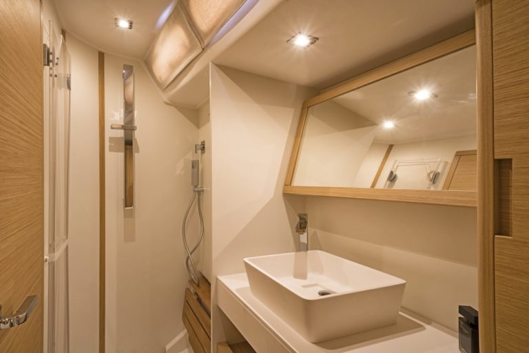 El baño que sirve a las dos cabinas de popa tiene un acceso privilegiado desde el lado derecho, que también es el más grande de los dos. Esta espaciosa habitación también alberga un armario que sirve como sala de secado para ceras húmedas.