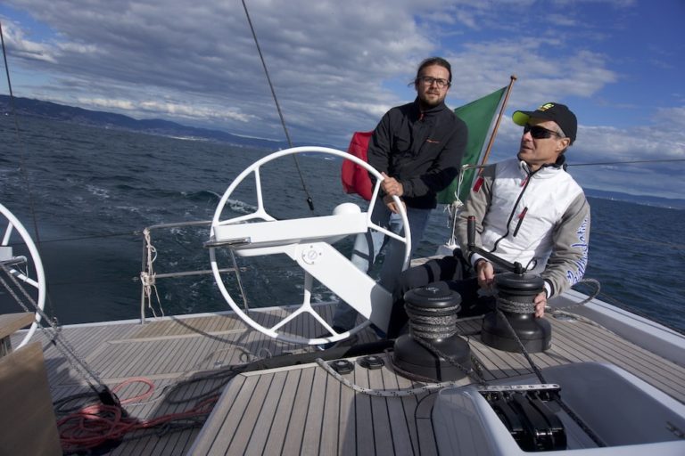 El viento en el Golfo de Trieste sopla alrededor de 12 nudos y crea ondas de luz en la superficie del mar. Justo el momento de abrir la lazy bag en la que se encuentra la vela mayor, que iremos y desenrollaremos rápidamente. Sostengo el viento y empiezo a terminar. El instrumento marca 8 nudos de velocidad, con un ángulo de viento real de 55 grados.