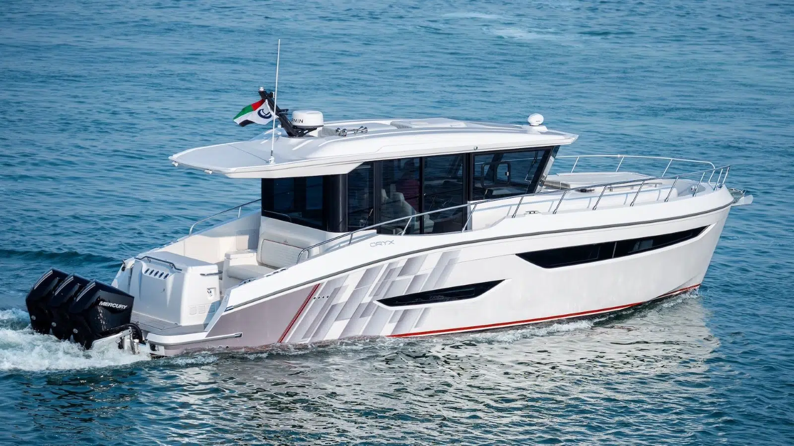 Equipado con dos fuerabordas Yamaha de 425 CV, este modelo de doce metros difiere un poco del modelo más pequeño: en primer lugar, este modelo está equipado con un Hard Top, y no con un T-Top como su predecesor. La ventaja de la capota rígida es que se une al parabrisas delantero, protegiendo el puesto de conducción no sólo del sol, sino también de los elementos. Además, esta conformación da lugar a la gran zona para tomar el sol en la proa, a la que se accede cómodamente desde la pasarela mediante un escalón. En el centro encontramos un solárium con respaldo abatible que da lugar a una dinette con mesa, donde pueden sentarse cómodamente cuatro personas, y justo detrás de los asientos del conductor, hay un mueble con nevera y cocina. Ni siquiera la cubierta inferior bromea con el espacio, en proa encontramos un gran camarote con cama doble y un espacioso baño con cabina de ducha separada.
